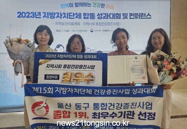 (뉴스21통신/임정훈기자) = 울산시 동구청이 7월 7일 보건복지부 주관으로 서울 The-K 컨벤션센터에서 열린 ‘제15회 지방자치단체 건강증진사업 성과대회’에서 지방자치단체 건강증진사업 종합부분 1위, 최우수기관으로 선정되어 보건복지부 장관표창과 함께 포상금 1,350만원을 받게 되었다.