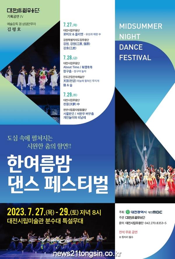 대전시립무용단의 제22회 ‘한여름밤 댄스 페스티벌’이 오는 7월 27일(목) 부터 29일(토) 까지 3일간 대전시립미술관 분수대 특설무대에서 진행된다.