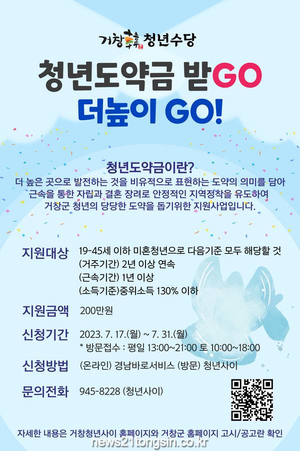 거창군은 민선 8기 공약사업인 거창형 청년수당 ‘청년 도약금’을 오는 17일부터 31일까지(15일간) 신청받는다고 11일 밝혔다.