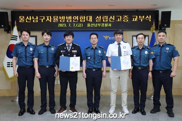 (뉴스21통신/최원영기자)=울산남부경찰서(서장 양순봉)는 지난 7일 경찰서 2층 소회의실에서 자율방범대를 대표하는 울산남구자율방범연합대(대장 박태진) 임원진을 만나 자율방범대 설립신고증과 위촉장을 교부하는 행사를 개최했다.