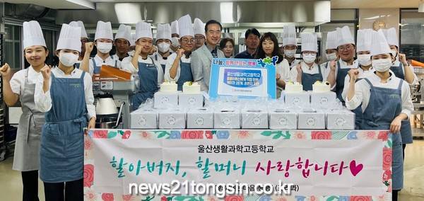 (뉴스21통신/임정훈기자) = 울산생활과학고등학교(교장 이경원) 재학중인 조리과 학생들이 달콤한 행복 이벤트를 마련해 신선한 감동을 전하고 있다. 조리과 학생들은 그동안 갈고 닦은 전공 실력과 정성을 듬뿍 담아 직접 만든 케이크 25개와 정성들여 쓴 손편지를 7월 11일 울산동구종합사회복지관(관장 이정석)에 전달했다.
