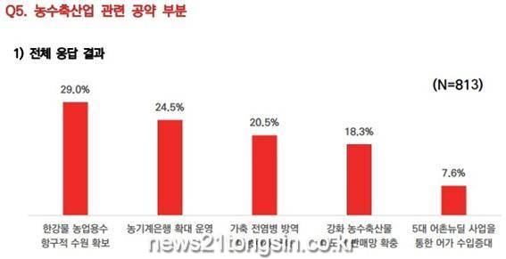 어르신 복지 공약 부분은 교통약자 군내버스 무료화 추진사업이 34.4%로 가장 높았다. 마지막 농수축산업 관련 공약사업의 경우 한강물 농업용수 항구적 수원 확보의 중요도가 가장 높은 것으로 나타났다.