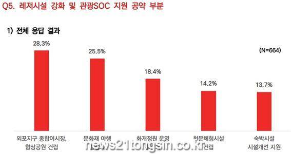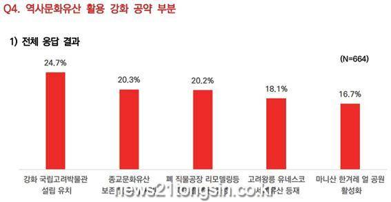 역사 문화유산 활용 강화 공약은 강화 국립고려박물관 설립 유치 추진사업이 24.7%로 가장 높았고, 마지막 문항인 레저시설 강화 및 관광 SOC 지원 공약 부분에서는 외포지구 종합어시장 및 함상공원 건립28.3%로 가장 높게 나타났다.