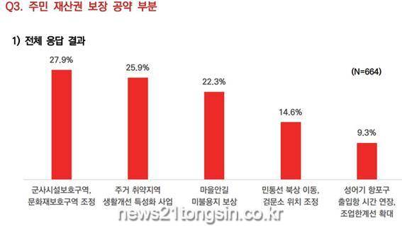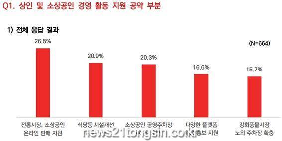 먼저 상인 및 소상공인 경영 활동 지원 공약 부분은 전통시장 및 소상공인 온라인 판매망 지원(26.5%)’, 주민 재산권 보장 공약에서는 군사시설보호구역 및 문화재보호구역 조정사업이 27.9%로 가장 높았다.