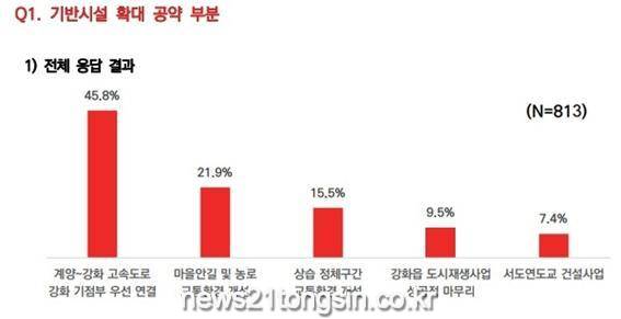 기반 시설 확대 부분에서 군민 45.8%강화~계양 고속도로 강화 기점부 우선 연결을 가장 중요하게 생각한다고 답했다. 이는 1·2차 여론조사를 통틀어 가장 높은 수치로 모든 연령과 성별, 지역별로도 강화~계양 고속도로 강화 기점부 우선 연결사업을 가장 중요하게 생각한다고 답했다.