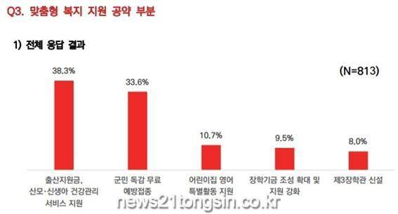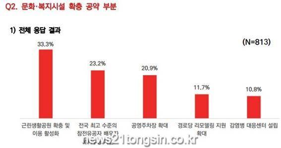 문화·복지시설 확충 공약 부분은 근린 생활공원 확충 및 이용 활성화33.3%로 가장 높았고, 맞춤형 복지 지원 공약은 출산지원금, 산모·신생아 건강관리 서비스 지원사업이 38.3%로 가장 높았다.