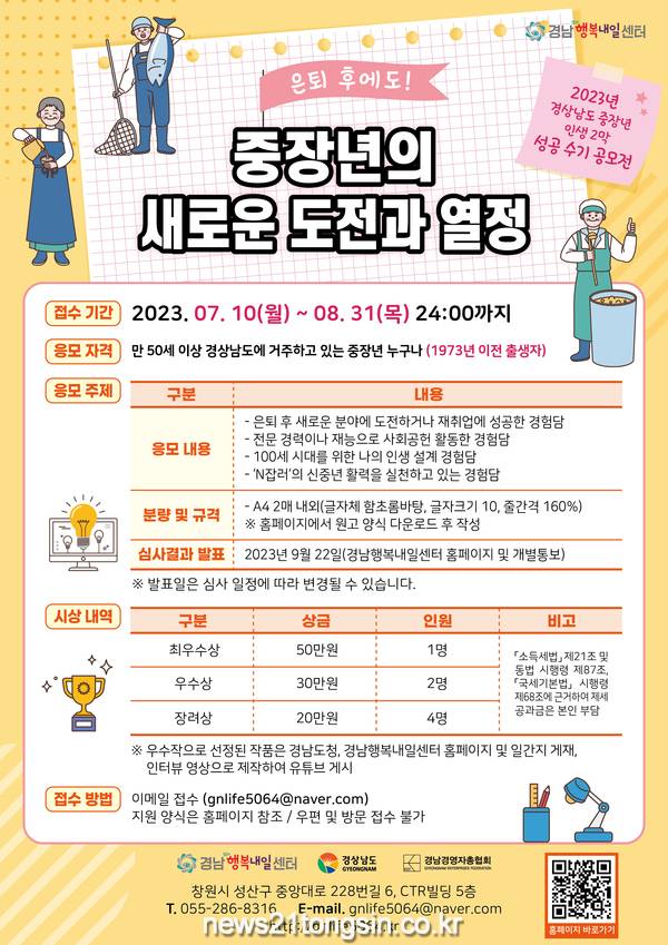 경상남도는 중장년 세대를 대상으로 인생 2막 성공 수기 공모전을 개최한다고 밝혔다.