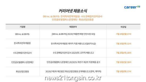 취업포털 커리어가 DB Inc. & DB FIS, 한국특허전략개발원, 수도권매립지관리공사, 인천글로벌캠퍼스운영재단, 화성산업진흥원의 채용 소식을 13일 발표했다.