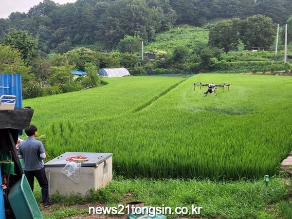 대전농업기술센터는 13일부터 벼 재배단지 491농가 402ha를 대상으로 농업용 드론을 활용한 벼 병해충 방제 지원 사업을 추진한다.