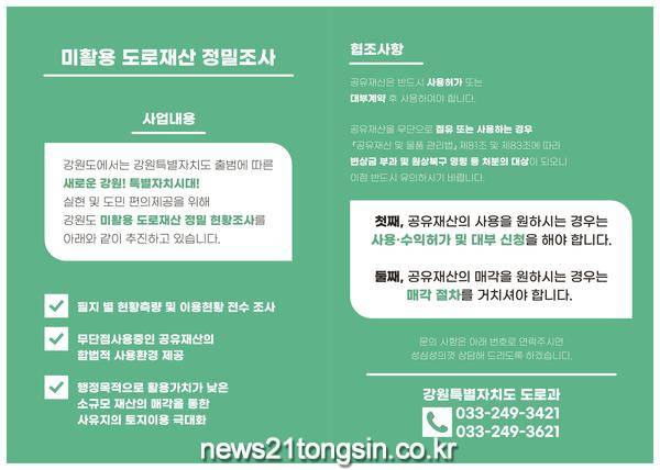 강원특별자치도는 정부의 긴축재정 기조와 지방세수 감소 등으로 우려되는 지방재정의 어려움을 헤쳐 나가기 위해 폐도 등 미활용 재산과 무단점유 추정재산 약 7천 3백 필지에 대한 정밀 현황조사를 실시하여 선별적 매각 및 사용료 부과를 통해 세수를 확보해 나갈 계획이다.