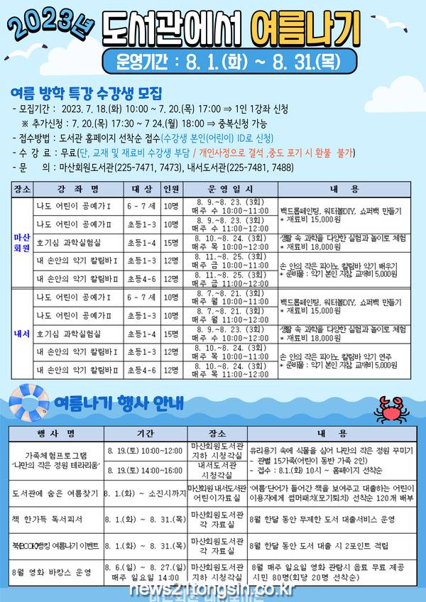 마산회원도서관과(과장 김명규)에서는 여름방학동안 시원한 도서관에서 즐길 수 있는 2023년 ‘도서관에서 여름나기‘ 행사를 마산회원도서관과 내서도서관에서 운영한다고 밝혔다.
