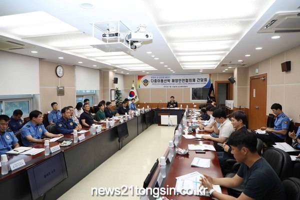군산해양경찰서(서장 박경채)는 어제(13일) 오후 2시에 청사 3층 소회의실에서 다중이용선박의 인명사고 예방을 위한 ‘다중이용선박 해양안전협의체(이하 해양안전협의체)’를 구성하고 첫 회의를 개최했다고 밝혔다.