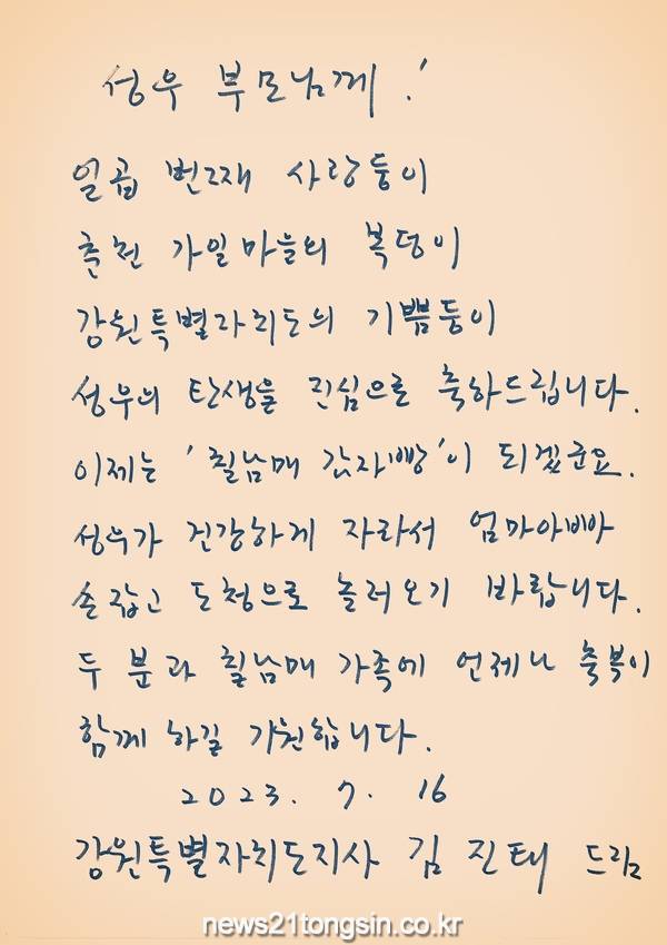 김진태 강원특별자치도지사는 일곱번째 다둥이를 출산해 화제가 되고 있는 춘천 가일마을 전동훈-류사라 씨 부부에게 득남을 축하하는 손편지를 전해 기쁜 마음을 전했다.