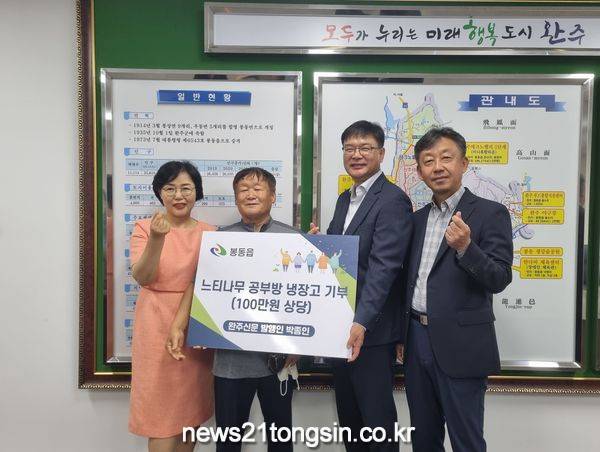 [전북=뉴스21] 오충일 기자= 완주군 봉동읍에 위치한 완주신문(발행인 박종인)이 봉동주공아파트 내 느티나무공부방에 100만원 상당의 냉장고 1대를 기부했다.
