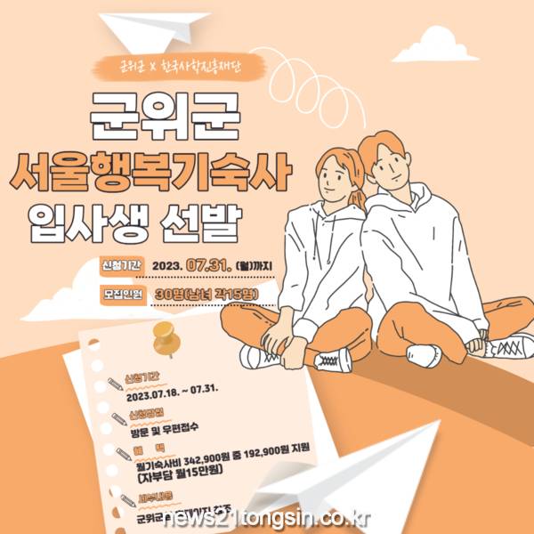 (사)군위군교육발전위원회(이사장 군위군수 김진열)와 한국사학진흥재단은 7월 18일부터 31일까지 14일간 행복기숙사(서울 동소문동)의 입사생 모집을 진행한다고 밝혔다.