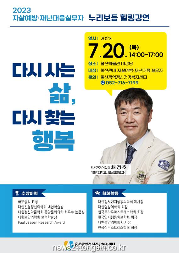 (뉴스21통신/우정석기자) = 울산시는 울산광역정신건강복지센터(센터장 김경승)가 7월 20일 오후 2시 울산박물관 대강당에서 ‘2023년 누리보듬 힐링강연’을 마련한다고 밝혔다.