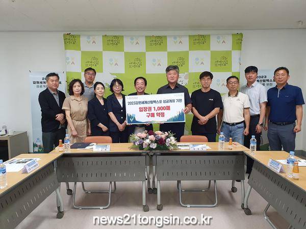 (재)강원세계산림엑스포 조직위원회(위원장 김진태)는 7월 25일 11시 조직위원회 사무실(고성군 토성면 인흥리)에서 『2023 강원세계산림엑스포』 성공 개최를 위하여 강원시니어클럽협회(회장 김성래)와 업무협약식과 입장권 사전구매 약정식을 진행했다.