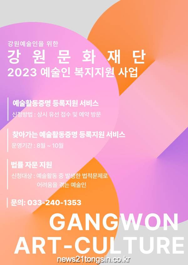 강원문화재단은 오는 8월부터 도내 시군 문화재단을 대상으로 수요조사를 거쳐 ‘찾아가는 예술활동증명 등록지원 서비스’를 운영한다.