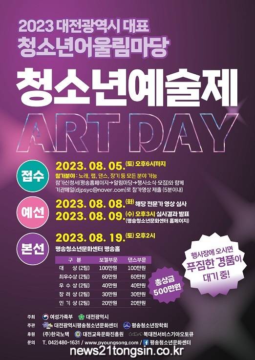 대전시는 제4차 청소년어울림마당인 ‘청소년 예술제 ART DAY’를 오는 8월 19일 오후 1시에 평송청소년문화센터에서 개최한다고 밝혔다.