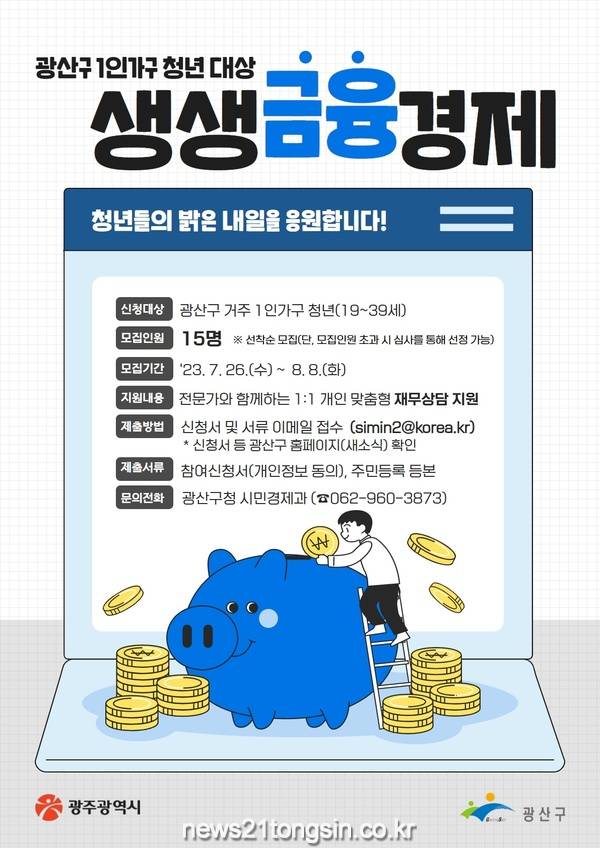 [뉴스21통신/장병기 기자] 광주 광산구가 청년 1인 가구의 금융역량을 강화하기 위한 생생금융경제 프로그램 참여자를 모집한다.