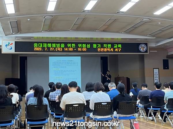 인천 서구(구청장 강범석)가 27일 올해 정기 위험성 평가를 앞두고 담당자 59명이 참석한 가운데 ‘중대재해예방을 위한 위험성 평가 직원 교육’을 진행했다.
