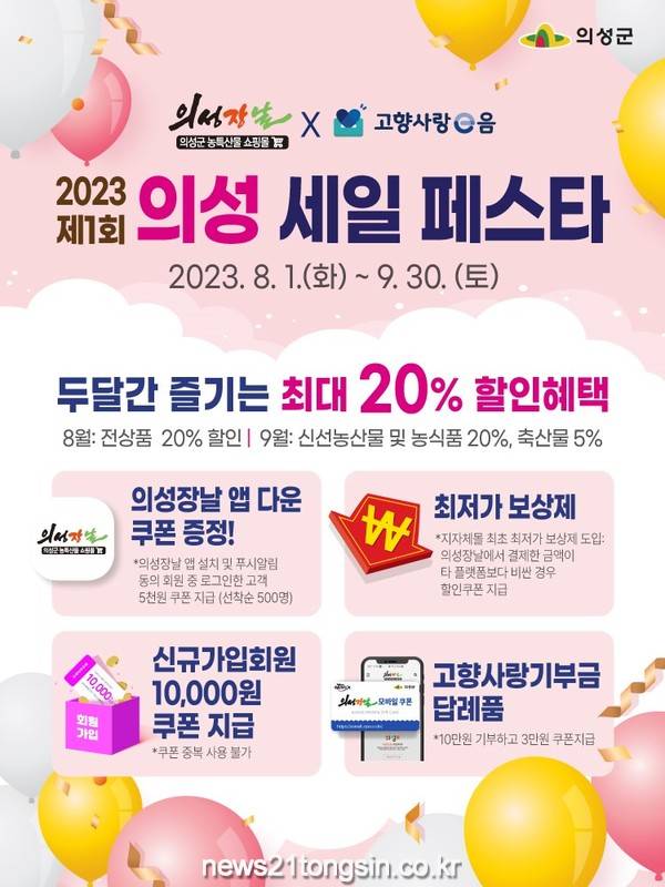 의성군은 본격적인 농산물 출하시기에 맞춰 입점업체와 소비자가 만족하는 플랫폼을 만들기 위해 의성군 대표 농특산물쇼핑몰인 의성장날에서 ‘제1회 의성 세일페스타’를 실시한다고 밝혔다.