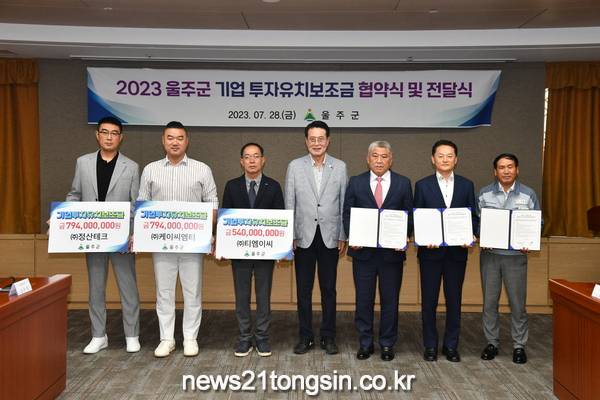 울주군은 이날 군청 비둘기홀에서 이순걸 군수와 각 기업 대표 등 관계자들이 참석한 가운데 관내 신규 투자 희망기업 협약식 및 관내 투자 완료 기업 기업투자유치보조금 전달식을 가졌다.