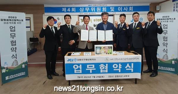 (재)강원세계산림엑스포 조직위원회(위원장 김진태)는 『2023 강원세계산림엑스포(2023.9.22.~10.22.)』 성공 개최를 위하여 지난 7월 29일 (사)강원지구청년회의소(춘천시 춘천로 66, 3층)에서 (사)강원지구청년회의소(회장 김성주)와 업무협약을 체결했다.