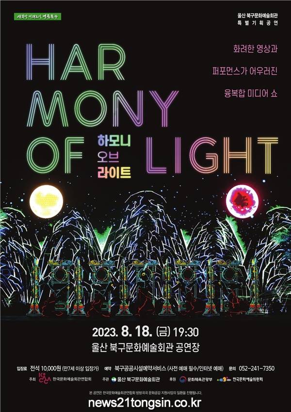 (뉴스21통신/권혁진기자) = 울산 북구문화예술회관은 오는 18일 오후 7시 30분 영상과 퍼포먼스가 결합된 융복합 미디어 쇼 '하모니 오브 라이트' 공연을 무대에 올린다.