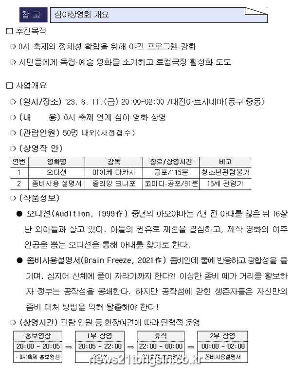 노기수 대전시 문화관광국장은 “0시 축제와 심야 영화 상영을 통해 시민들이 다양한 문화 예술을 즐기고, 여름밤의 추억을 만들 수 있기를 기대한다”고 말했다.