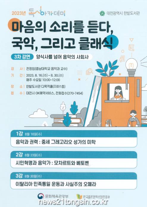 대전한밭도서관은‘마음의 소리를 듣다:국악, 그리고 클래식’을 주제로 관련 분야의 교수 및 전문가 5명을 초청해‘2023년 독서아카데미’를 진행한다.
