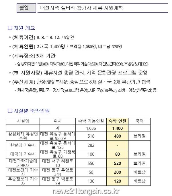 그동안 대전시는 관내 대학교 기숙사와 지역에 소재한 기업·공공기관 인재개발원 등을 전수 조사하여 숙박 여건에 대한 체크리스트 점검을 통해 총 6개 기관 1,636명이 체류할 수 있는 시설을 확보했다.