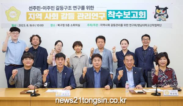 (뉴스21통신) 유재원기자 = 대구광역시 북구의회 의원 연구단체인 「지역사회 갈등관리를 위한 연구회」는 8월 9일(수) 선주민-이주민 갈등구조 연구를 위한 지역사회 갈등관리 연구에 관한 착수보고회를 개최했다.