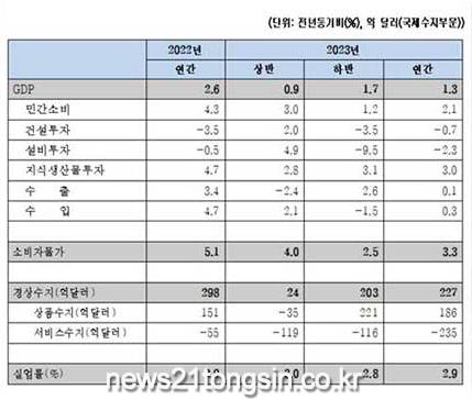 또 마이너스 성장을 지속해온 설비투자는 내수 침체와 글로벌 경기 위축에 따라 역성장하고, 건설투자는 원자재 가격 상승에 따른 공사 차질 등으로 감소세를 보일 것으로 예상했다.