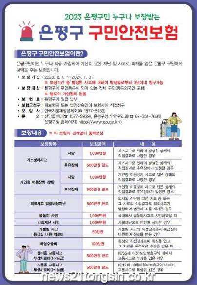 서울 은평구(구청장 김미경)는 일상생활에서 각종 사고·재난으로 피해를 입은 구민을 보호하고 재정적인 보상을 위해 ‘은평구 구민안전보험’을 시행한다.
