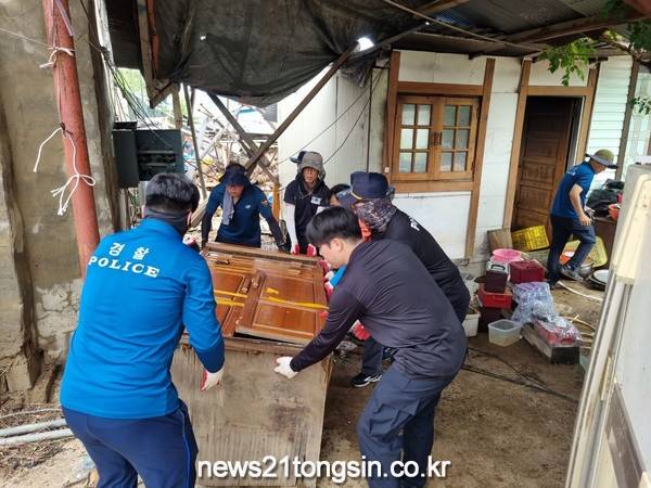 군위경찰서 직원 30여 명은 태풍으로 침수된 주택 내 천막 철거 및 내부에 유입된 토사 및 진흙을 제거하고 주변 환경을 정비하는 등 일손이 부족한 가정에 힘을 보탰다.