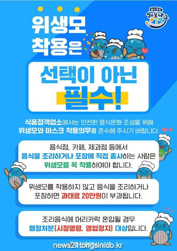 (뉴스21통신/최원영기자)=울산 남구는 8월부터 음식점, 카페, 제과점 등 식품접객업소의 종사자가 음식을 조리하거나 포장할 경우 반드시 위생모를 착용하여 안전한 음식문화가 조성될 수 있도록 다양한 홍보활동을 전개한다고 밝혔다.