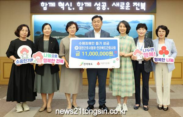 대한간호협회(회장 김영경)와 전라북도간호사회(회장 신은숙)에서는 지난 7월 집중호우로 인해 피해를 입은 도민들을 위해 써달라며 수재의연금 1,100만원을 전라북도에 기탁했다.