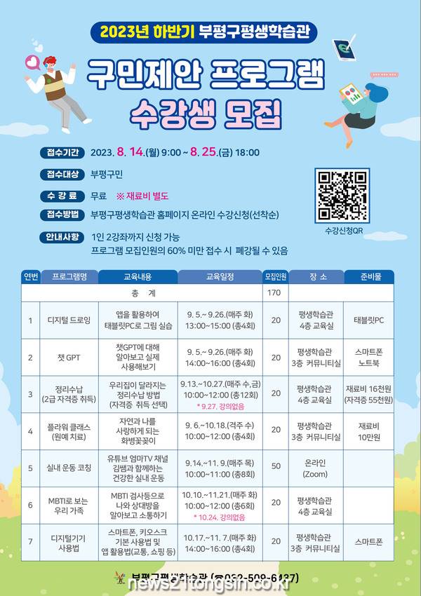 부평구(구청장 차준택)는 오는 8월 14일부터 25일까지 ‘2023년 부평구 평생학습 하반기 구민제안 프로그램’ 수강생을 모집한다.