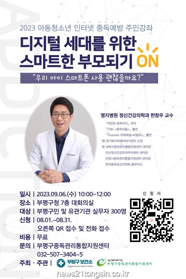 강의 주제는 ‘디지털 세대를 위한 스마트한 부모되기 ON-우리 아이 스마트폰 사용 괜찮을까요?’로, 청소년 중독치료 전문가 명지병원 정신건강의학과 한창우 교수가 인터넷 중독 문제를 둘러싼 세대 간 갈등을 해결할 수 있는 건강한 방법들을 소개한다.