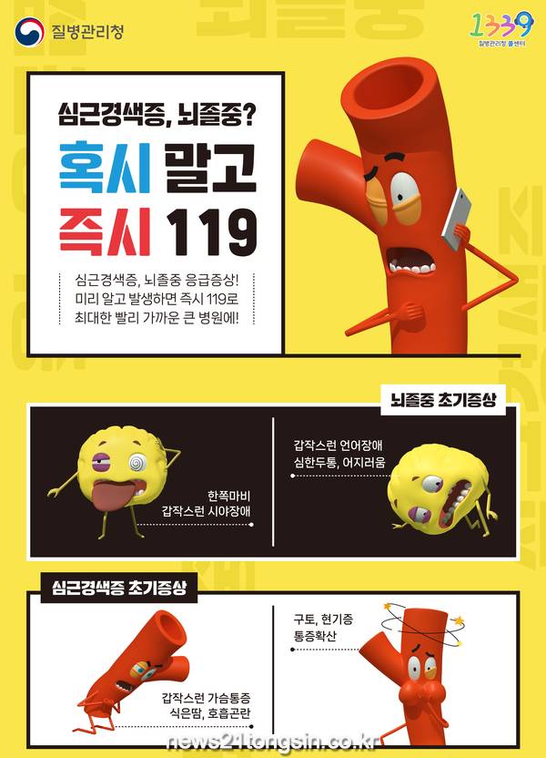 심뇌혈관질환 조기증상은 △한쪽 마비, 갑작스러운 시야장애 △갑작스러운 언어장애, 심한 두통, 어지러움 △갑작스러운 가슴 통증, 식은땀, 호흡곤란 △구토, 현기증, 통증 확산 등이며, 증상 발생 시 즉시 119로 신고해 최대한 빨리 가까운 큰 병원으로 가야 한다.