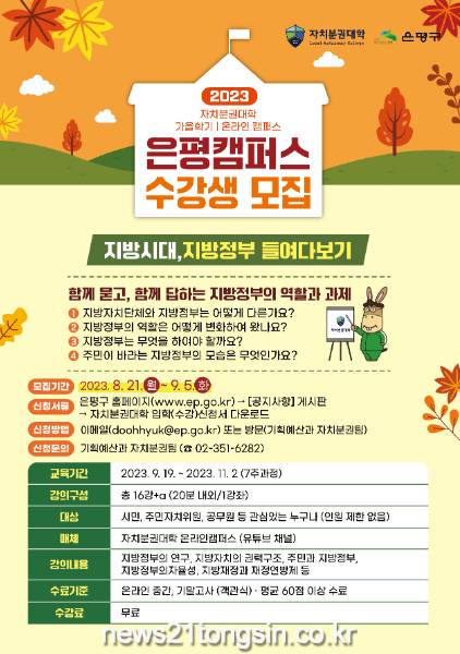 서울 은평구(구청장 김미경)는 자치분권대학 가을학기 캠퍼스를 오는 9월 19일부터 운영한다고 밝혔다.