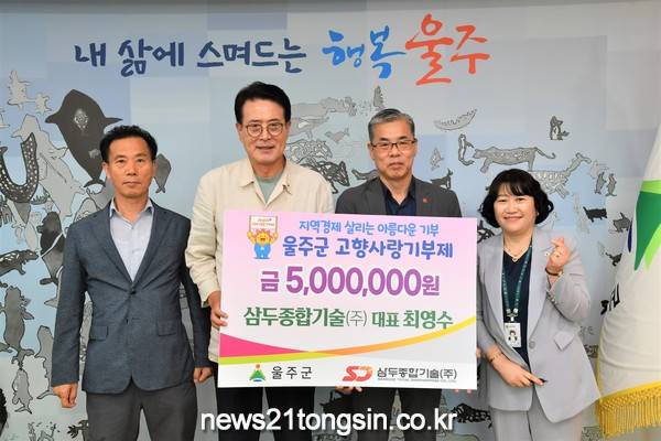 (뉴스21통신/우정석기자) = 최영수 삼두종합기술(주) 대표가 17일 울주군청을 방문해 고향사랑기부금으로 개인 연간 최고 기부액인 500만원을 전달하며, 고향사랑기부 행렬에 동참했다.