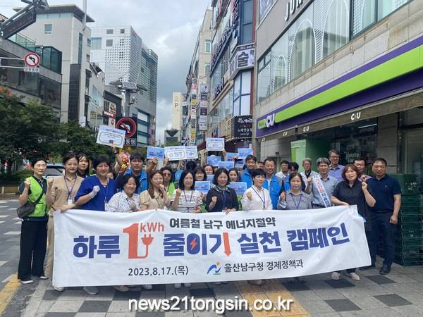 (뉴스21통신/최원영기자)=울산 남구(구청장 서동욱)는 에너지사용량이 급증하는 하절기를 맞아 에너지 절약문화 확산의 일환으로 17일 남구 삼산동 디자인거리 일원에서 ‘2023년도 여름철 남구 에너지 절약 캠페인’을 실시했다.