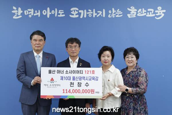 (뉴스21통신/우정석기자) = 8월 17일(목) 11시 울산광역시교육청에서 울산사회복지공동모금회(회장 전영도)의 1억원 이상 개인 고액 기부자 모임인‘아너 소사이어티’121호 신규 회원 가입식이 진행되었다. 신규 아너 회원의 주인공은 천창수 제10대 울산광역시교육감이다.