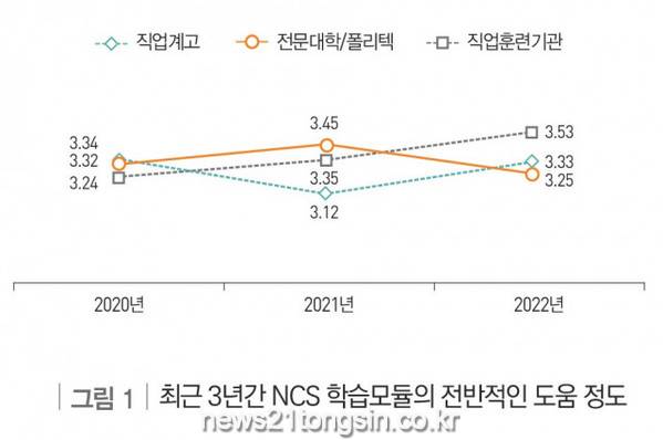 국가직무능력표준(NCS) 학습모듈의 최근 3개년간 활용 추이를 조사한 결과, 직업훈련기관에서는 활용 만족도가 꾸준히 증가하고 있지만 직업계고·전문대학에서는 반드시 그렇지는 않은 것으로 나타났다.