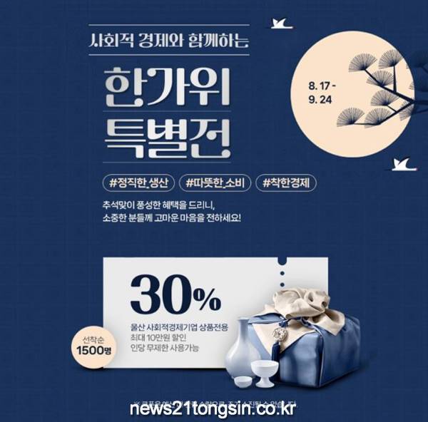 (뉴스21통신/우정석기자) = 울산시는 8월 17일부터 9월 24일까지 울산 사회적경제기업 25개사가 참여한 가운데 ‘2023년 사회적경제와 함께하는 한가위 특별전’을 마련한다고 밝혔다.