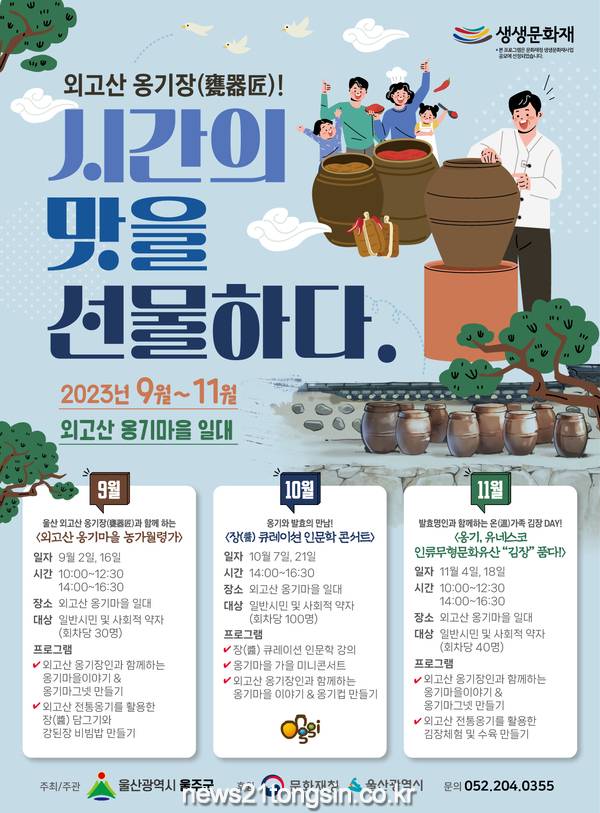 (뉴스21통신/우정석기자) = 울산시 울주군이 다음달부터 오는 11월까지 외고산 옹기마을 일대에서 2023년 지역문화재 활용사업으로 생생문화재 행사 ‘외고산 옹기장(甕器匠)! 시간의 맛을 선물하다’를 운영한다고 18일 밝혔다.