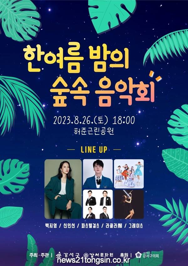 강서구 관계자는 “환상적인 하모니로 깊어가는 여름밤의 무더위를 잊게 해줄 숲속 음악회를 준비했다”라며 “남녀노소 모두 즐길 수 있는 공연을 준비한 만큼 허준근린공원을 찾아 잊지 못할 추억을 만들어가시길 바란다”라고 말했다.