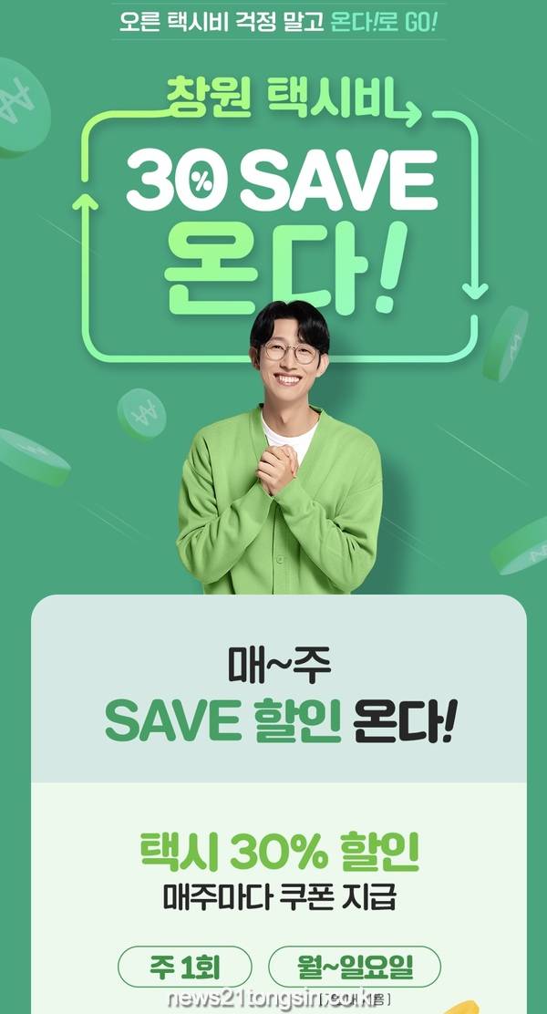 또한 창원통합콜 활성화를 위해 스마트폰에서 “티머니온다”를 다운 받아 회원 신규가입하면 자동결제 이용 시 택시요금 50% 할인쿠폰(최대5,000원) 지급하며, 기존 회원은 8월 21일부터 매주 1회 택시요금 30% 할인쿠폰(최대 3,000원)을 지급한다.